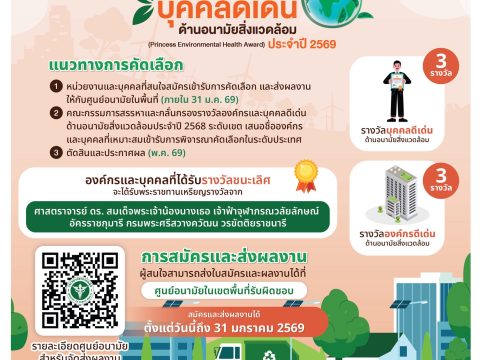 ขอเชิญองค์กรและบุคคล ภาครัฐ ภาคเอกชน และประชาชน สมัครเข้ารับคัดเลือก รางวัลองค์กรและบุคคลดีเด่นด้านอนามัยสิ่งแวดล้อม (Princess Environmental Health Award) ประจำาปี 2568