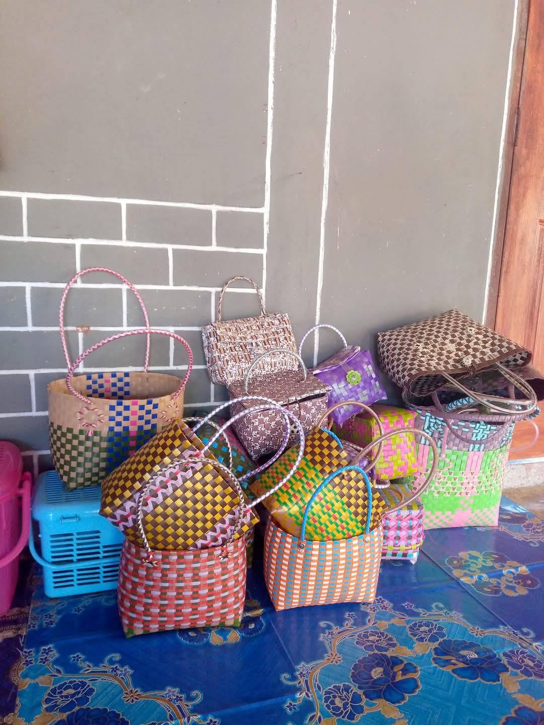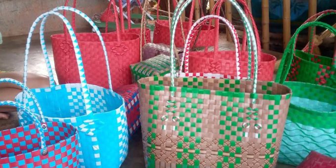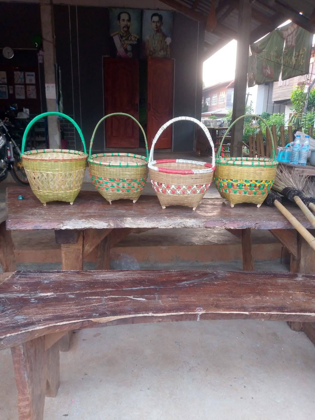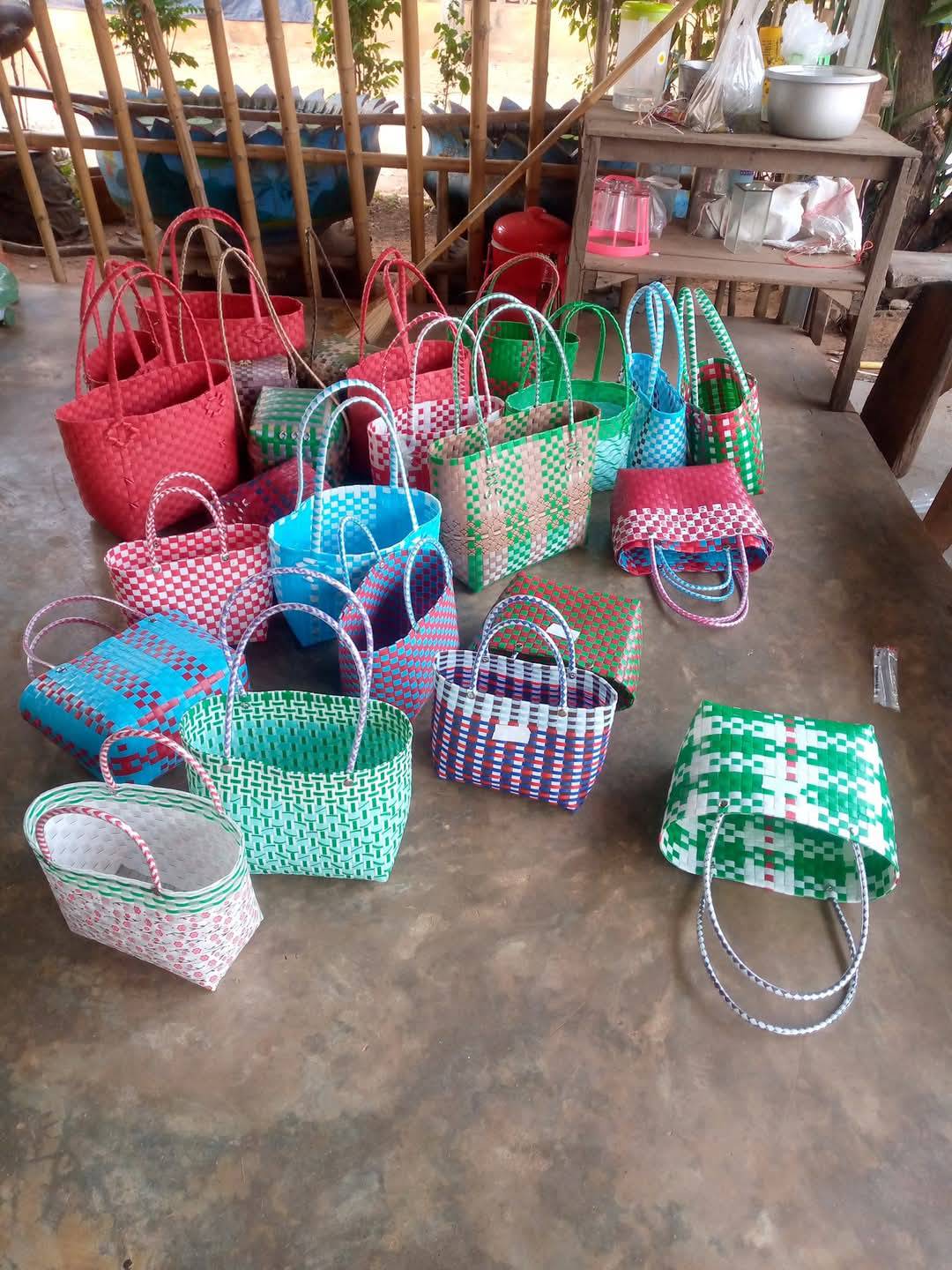 ผลิตภัณฑ์จากขยะรีไซคิล (ตะกร้าจากสายรัดของ) จากกลุ่มจักสานไม้ไผ่บ้านหมูม่น ม.5 ตำบลดอนเตย อำเภอนาทม จังหวัดนครพนม