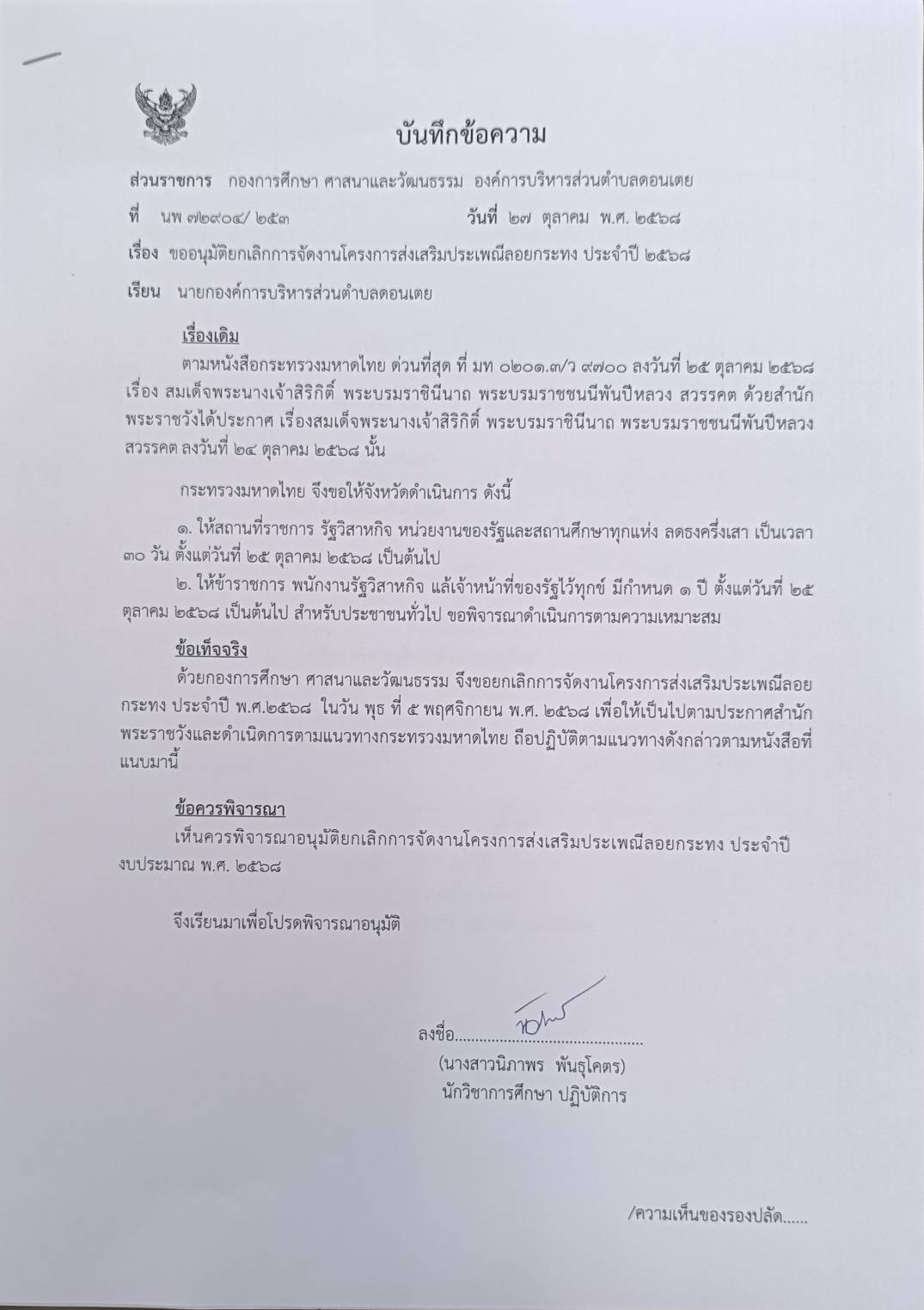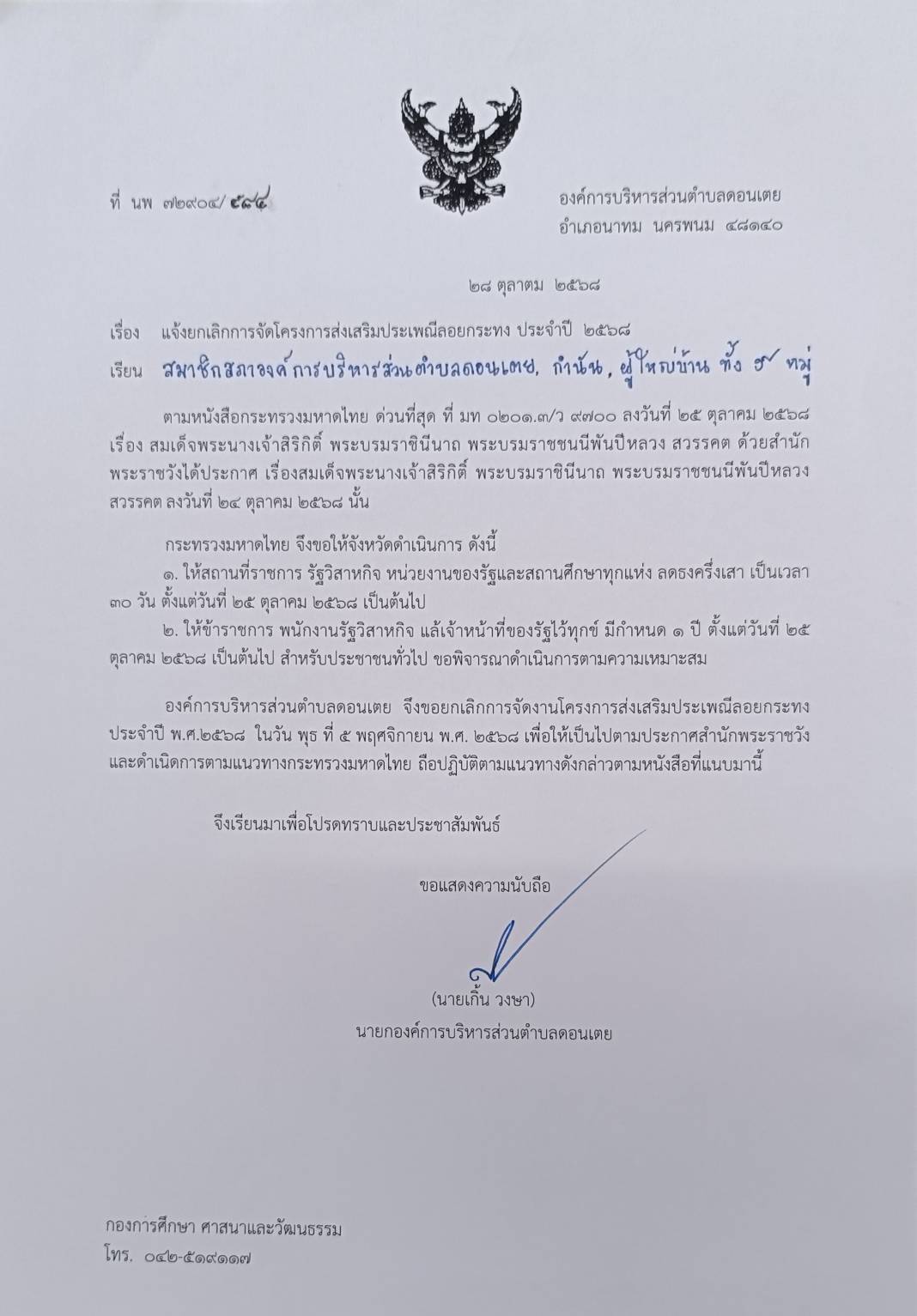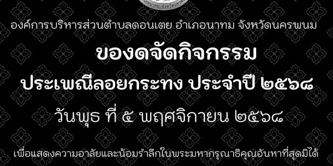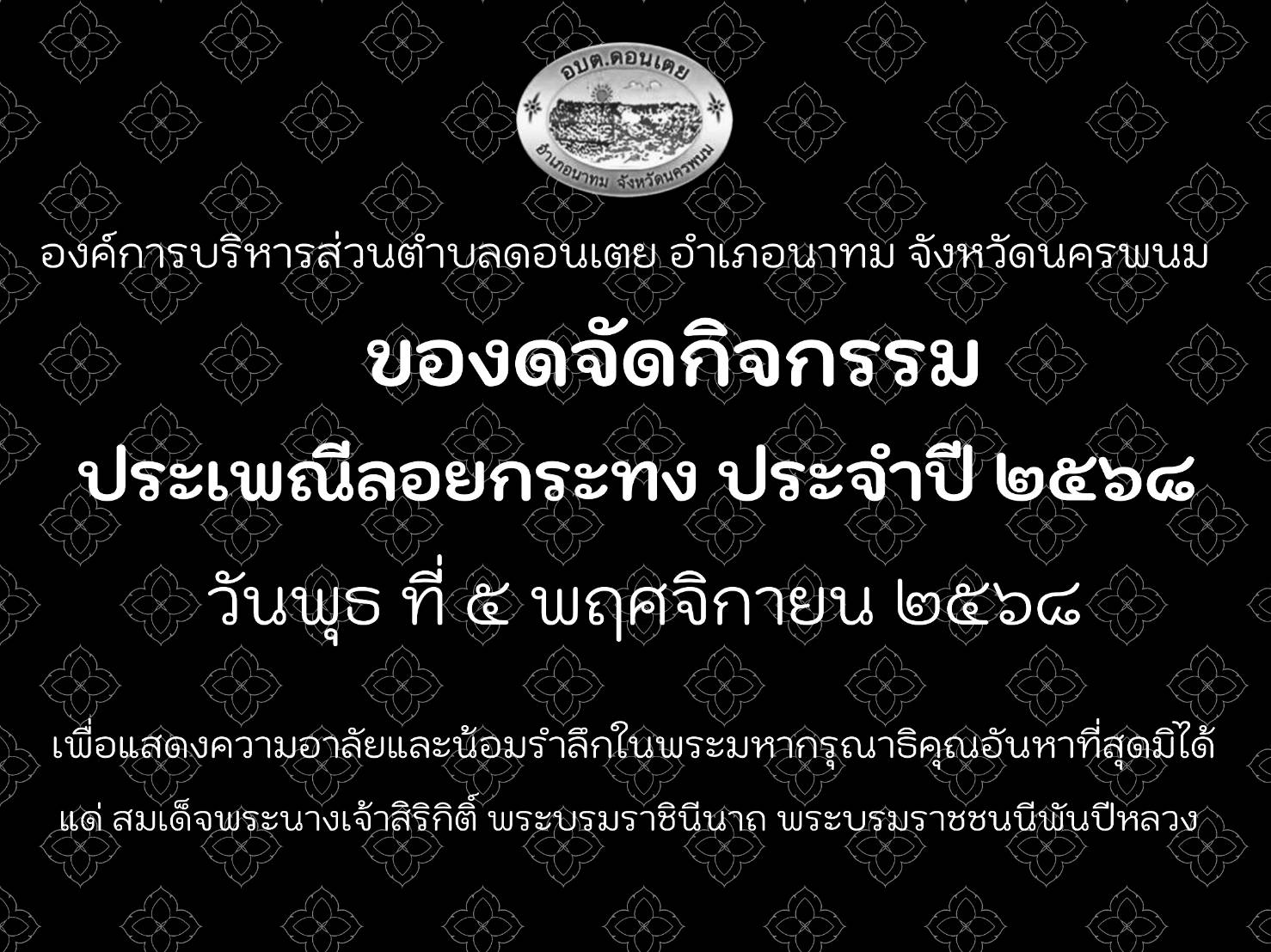 องค์การบริหารส่วนตำบลดอนเตย อำเภอนาทม จังหวัดนครพนม ของดจัดกิจกรรม ประเพณีลอยกระทง ประจำปี ๒๕๖๘ วันพุธ ที่ ๕ พฤศจิกายน ๒๕๖๘ เพื่อแสดงความอาลัยและน้อมรำลึกในพระมหากรุณาธิคุณอันหาที่สุดมิได้ แต่ สมเด็จพระนางเจ้าสิริกิติ์ พระบรมราชินีนาถ พระบรมราชชนนีพันปีหลวง